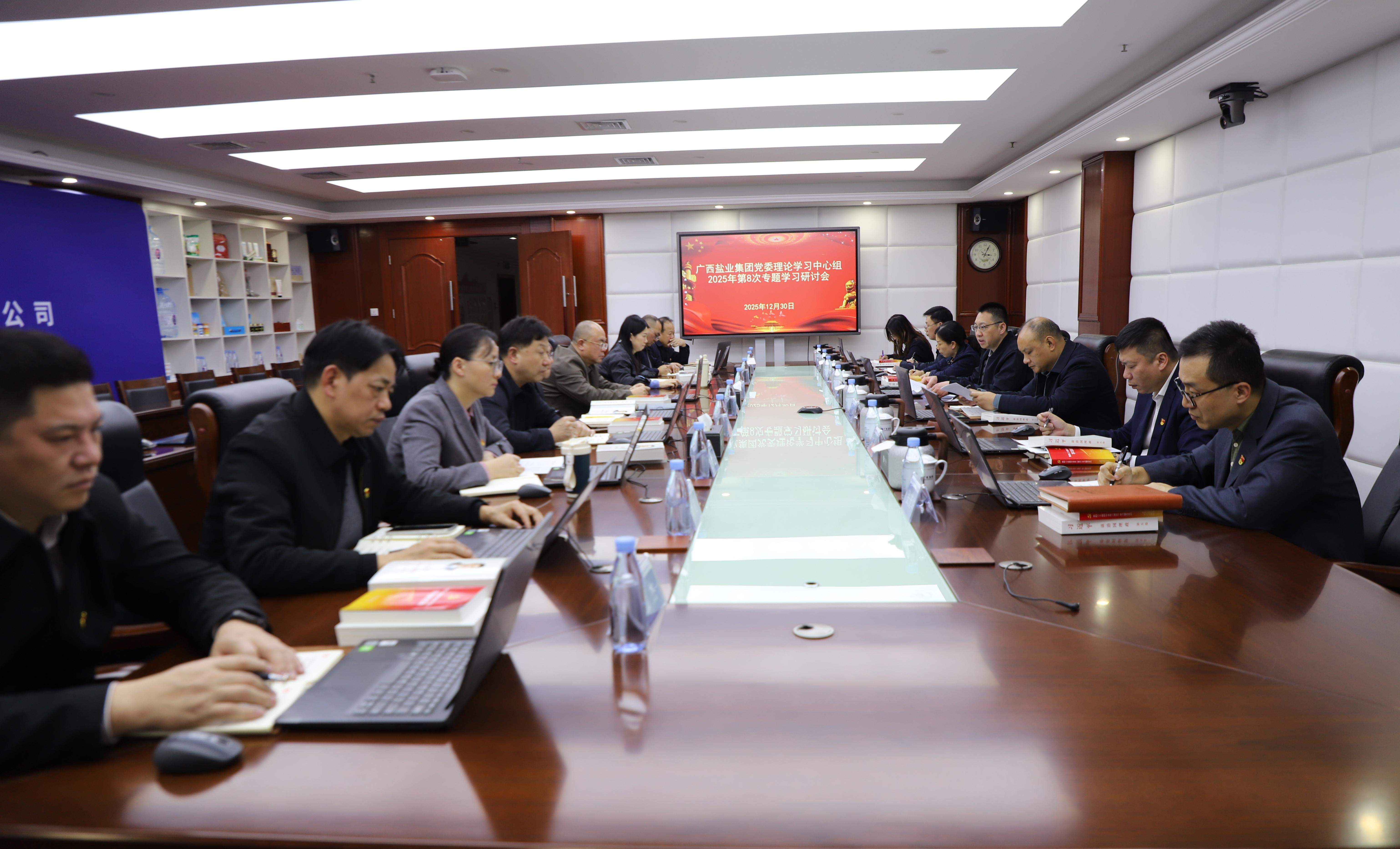 12月30日,广西盐业集团党委召开理论学习中心组2025年第八次专题学习研讨会,深入学习贯彻习近平总书记近期重要讲话和重要指示精神,传达学习党内有关重要条例及自治区党委相关会议精神,并就贯彻落实工作研究部署。集团党委书记、董事长邱潮涌主持会议并分享学习体会。