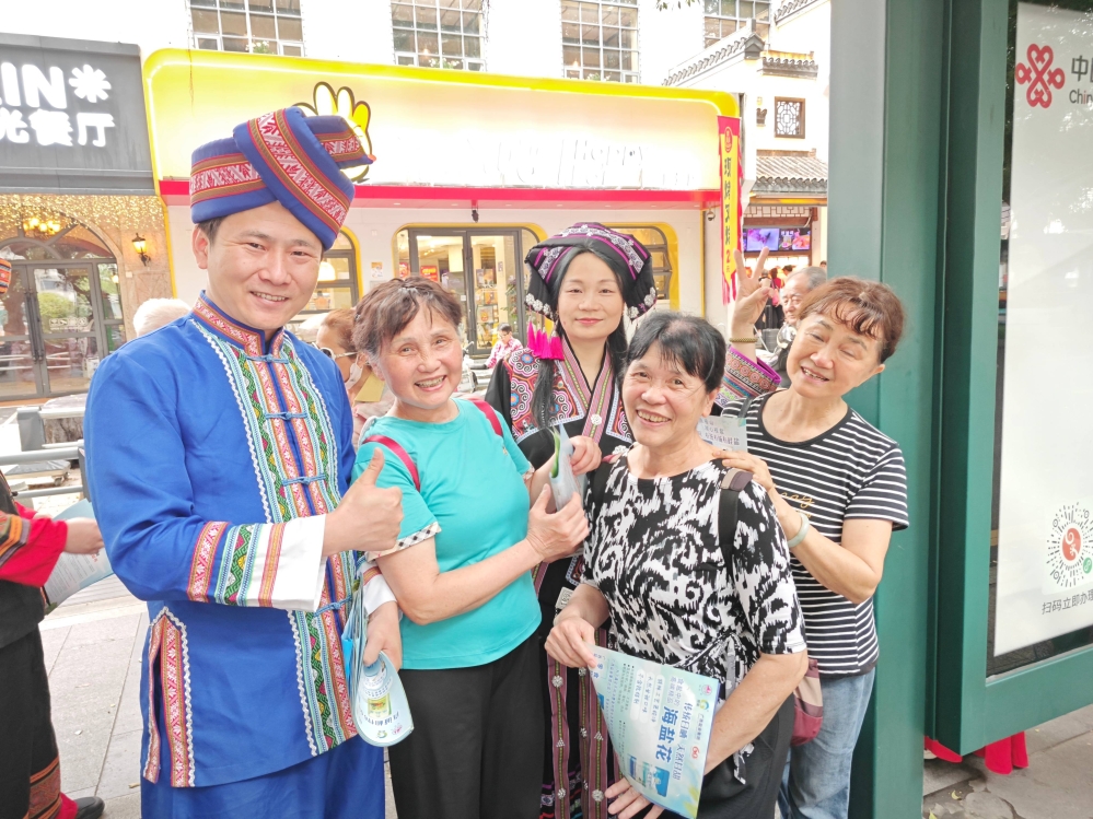 玉林公司组织职工身着民族传统服饰,深入乡镇村屯开展“桂盐飘鲜融百味,民族团结铸同心”地推宣传活动。现场工作人员通过发放宣传资料、现场讲解、互动问答等形式普及科学用盐知识,向群众推介高端盐品,重点宣讲低钠减盐的健康益处。活动吸引众多群众驻足咨询,现场氛围热烈浓厚。活动以贴近群众的方式传播健康用盐理念,在科普服务中增进各民族群众交流,用心守护百姓健康生活,有效提升“桂山”“桂盐”品牌知名度与影响力。