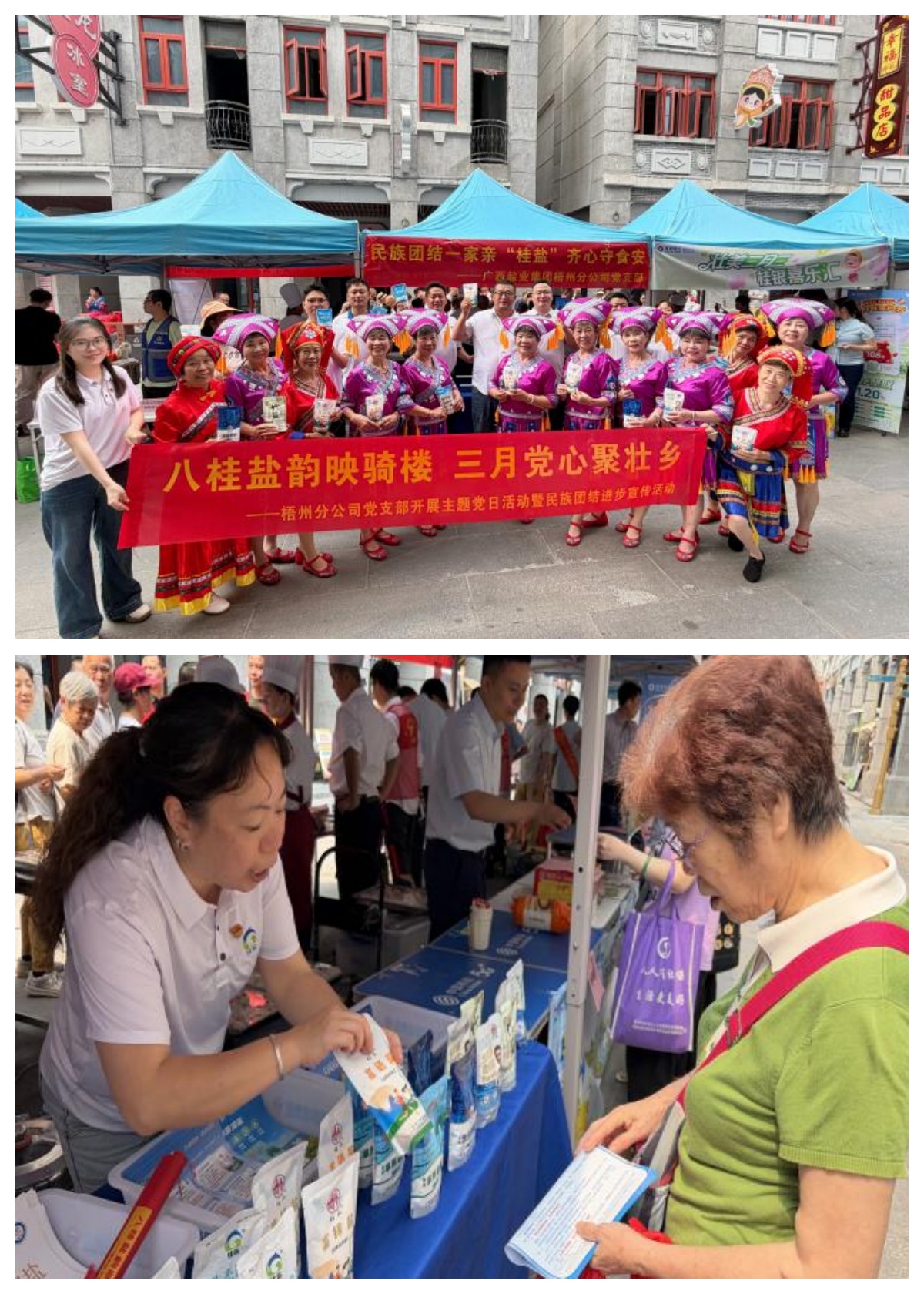 梧州分公司联合南中社区,在百年骑楼城开展“八桂盐韵映骑楼,三月党心聚壮乡”主题党日活动。青年党员与各族居民共跳竹竿舞、同抛绣球;在美食体验区,将“桂山”牌高端盐融入五色糯米饭制作,以“边做边讲”形式传递健康用盐知识。同步联合梧州市万秀区委统战部开展法治宣传,发放资料、解答咨询,切实当好民族团结“连心桥”。